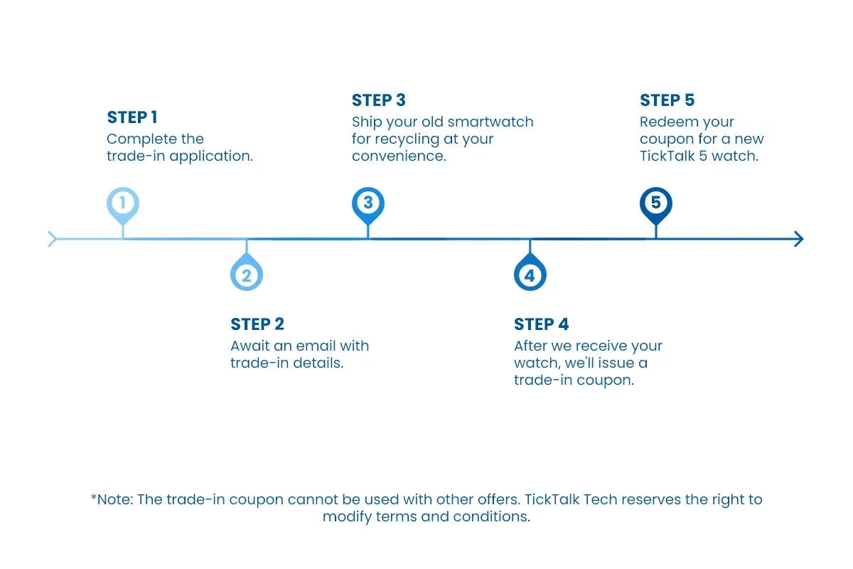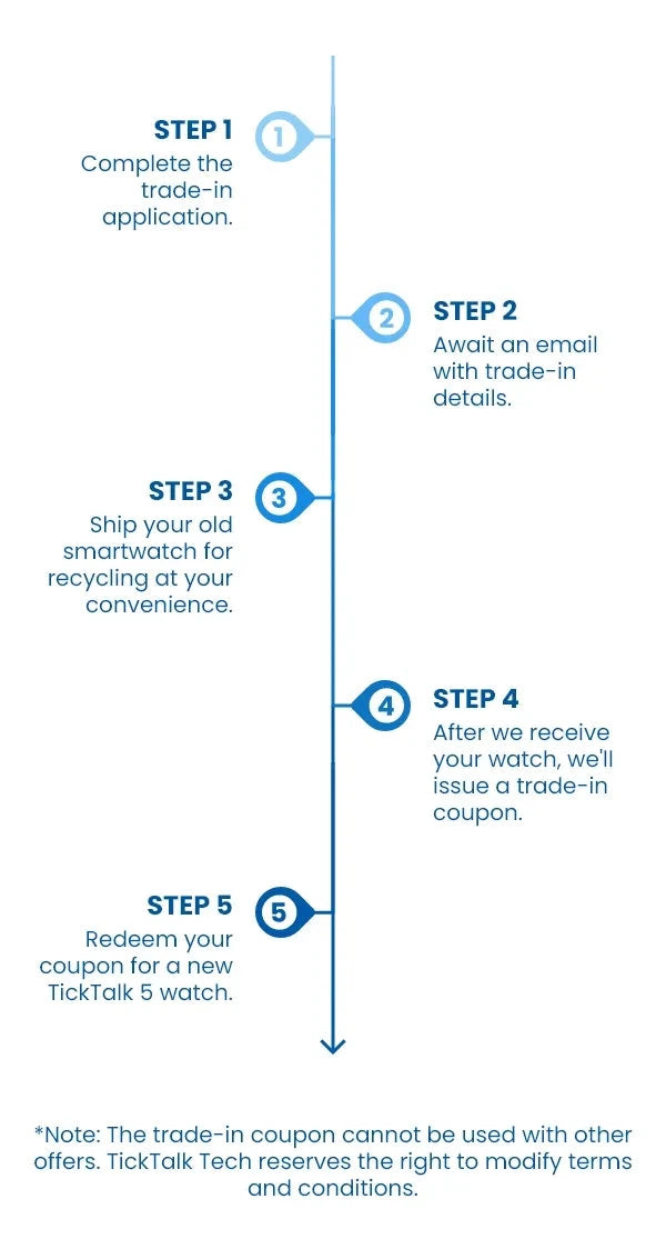 Thank you for choosing TickTalk! We're excited to offer you up to $30 off when you trade in your old TickTalk watch through our Trade-In Program. Please read the steps below, fill out, and submit your Trade-In form. You will receive an email response from us within 1-2 business days.